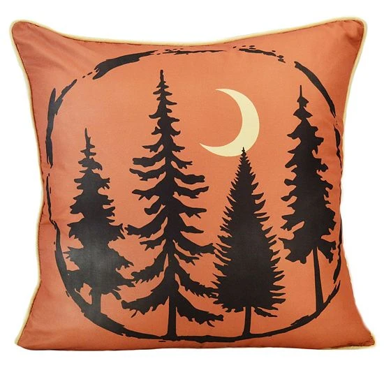 - This Tree accent pillow features a tree line motif adorned with a crescent moon on an orange background